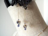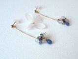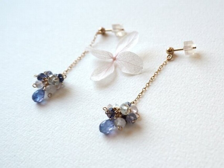 耳元からぶら下がるシャンデリアをイメージしてピアスを作りました。鮮やかな青紫のタンザナイトのドロップに、ニュアンスのある白~青のグラデーションで、レインボームーンストーン、アイオライト、タンザナイト、アクアマリン、ごく薄いピンクのローズクォーツのボタン石を散りばめています。耳元はあえてシンプルにスタッドからチェーンが下がり、視線が下のシャンデリア部分に向けられるように。小さいながら華やかに揺れるピアスはとても可愛らしいです。