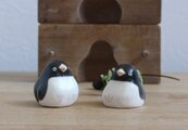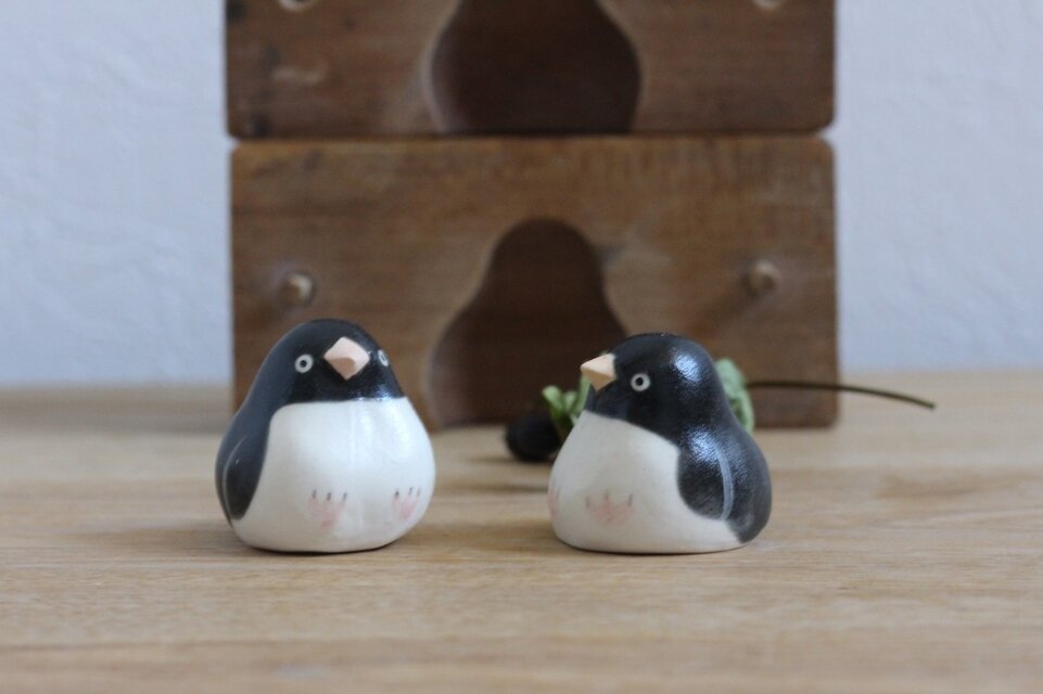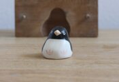 和菓子屋さんからゆずりうけたひよこまんじゅうの型にひとつひとつ土を込めて、ちいさなひよこを作りました。こちらは6月の新作、おすわりスタイルのアデリーペンギン!まるまるとした形と前にちょこんと出た足が可愛らしいです。顔もとぼけたような憎めない表情になりました。受注制作でお作りしています。