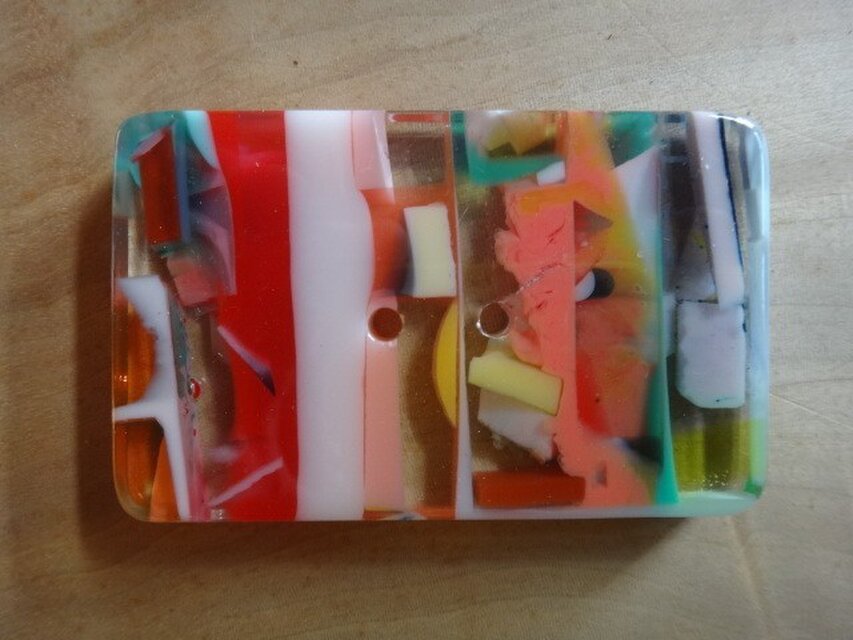 ポリエステル樹脂で色を作り流して切ってまた流して…と10回くらい繰り返して作った大きな四角ボタンです。30グラムくらいありますのでバックの重しなどにも・・・