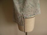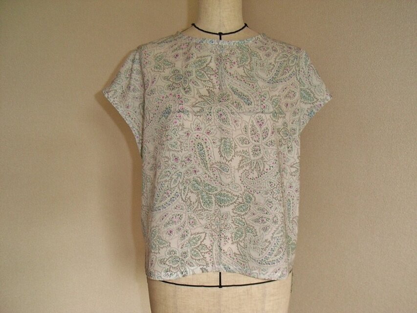 フレンチスリーブでゆったり目のシルエットになっています。裾は前後差をつけました。衿ぐり、袖口はバイアスで仕上げました。後ろスラッシュあきでカギホックが付いています。