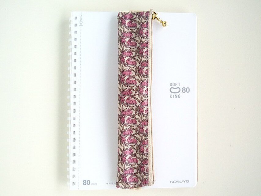 リバティの人気生地(ビニールコーティングつや無)、コットンテイル Cotton Tail(ピンク)でペンケース(A5サイズ用ゴムバンド付き)を作りました。