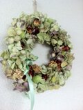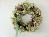 若葉色のあじさいをベースに、マーブル模様のミニバラ、カーネーション、ポアプランツのリースです。