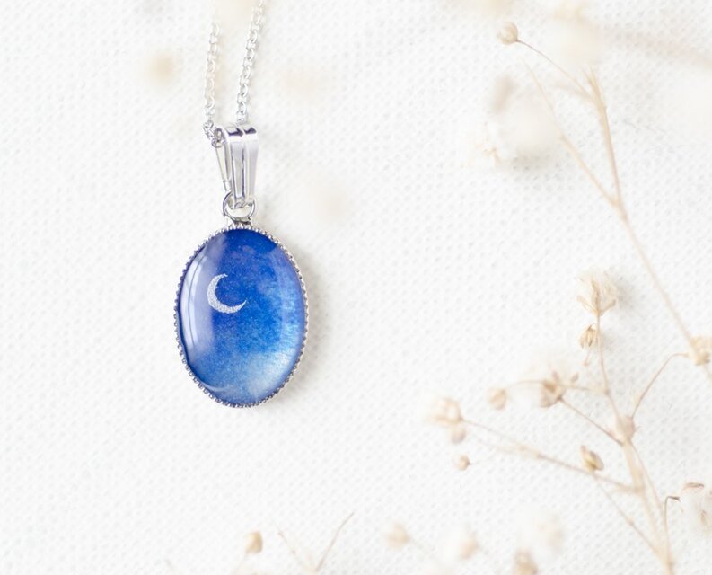 手描きのオリジナルイラストを樹脂で閉じ込めたちいさなペンダントです。