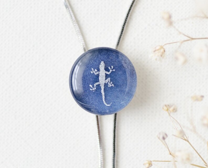 銀色のヤモリを描いた絵(原画)を樹脂でとじこめたループタイです。