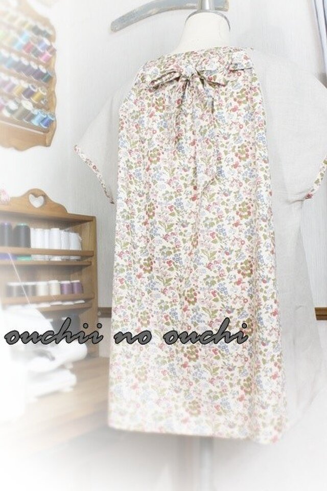 しっとりリネン100サンドベージュと切替はリバティタナローンの大人気柄Nancy Ann 柔らかブルー&レッド系 ベースはベージュ