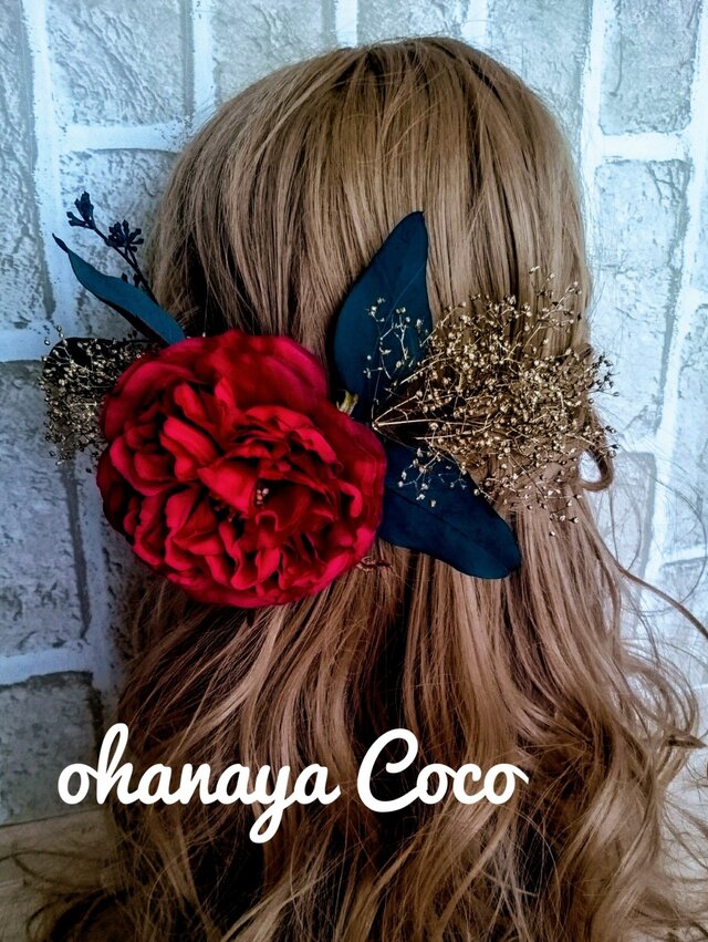 こちらの商品は赤いローズとユーカリの髪飾り7点Setです。