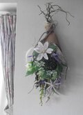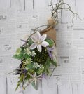 さわやかな優しいラベンダー〜ホワイトのクレマチスを主役にナチュラルなスワッグを作りました。グリーンの色合いにラベンダー〜ホワイトが入った初夏らしい雰囲気の壁掛けです。グリーンのボールはゴマのさやを細工して作られたもので、なかなかおもしろい愛らしい花材です。また深い緑の色合いのリーフはプリザーブド加工されたグレビレアです。