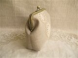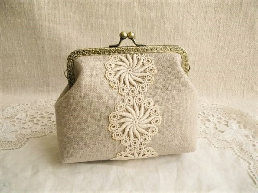 エクリュリネンにアンティークモチーフレースをのせたがま口ポーチ