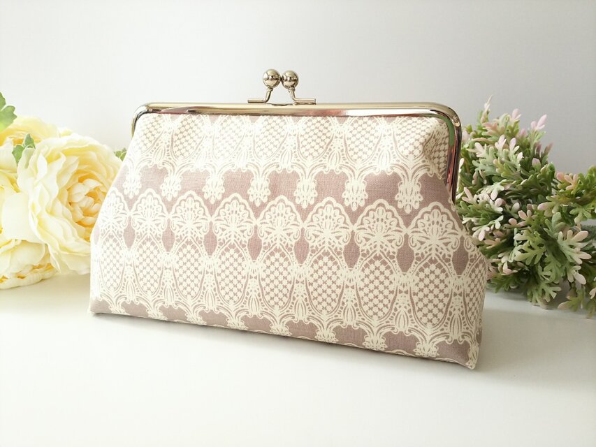 ◆【売り切れ】【再販5】フェミニンなレース柄がま口ポーチグレージュ*ガーリー*かわいい*プレゼントや旅行に◆