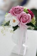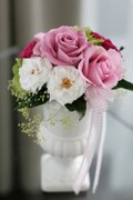 ヨーロッパ調のトラディショナルな花器に白とピンクのローズでアレンジしました。