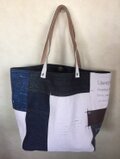 持ち手/白本革(ヴィンテージ新品(ダメージもデザインの一部です。) 左サイド/茶色本革 正面/ステンシル&デニムコラージュ&星スタッズ(海外買い付け品)