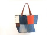 デニムはダイナミックなパターンで配置しました。持ち手は茶の本革。