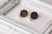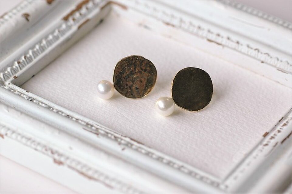 真鍮板を切り出し、表面にテクスチャーを加え淡水パールを差し込み装着しました。