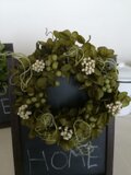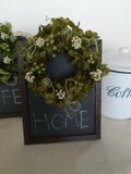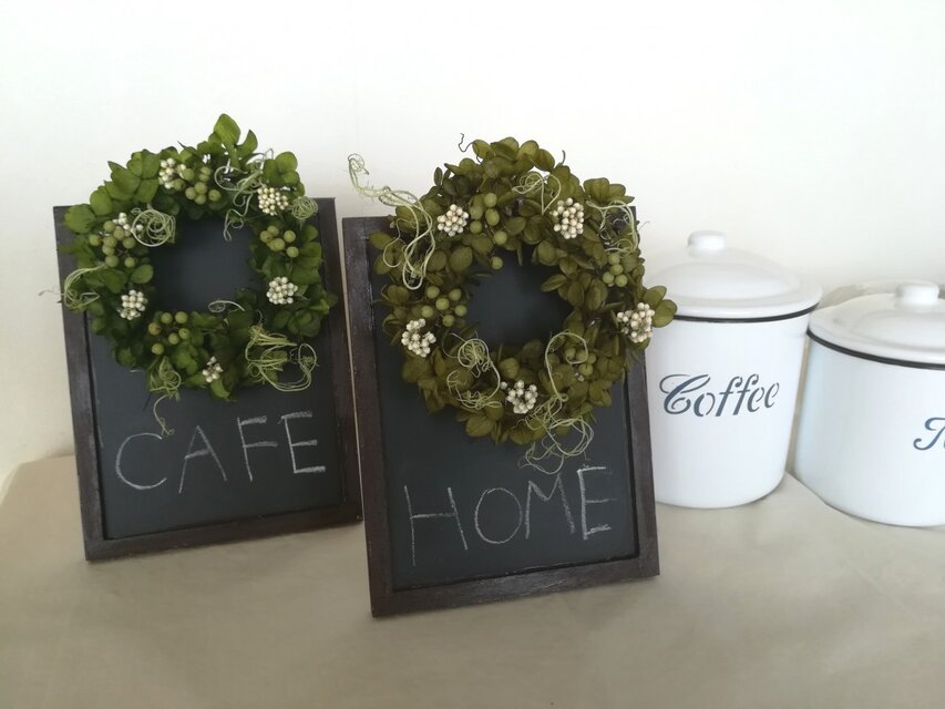 小さなブラックボードにグリーンのミニリースを飾ったアレンジです。