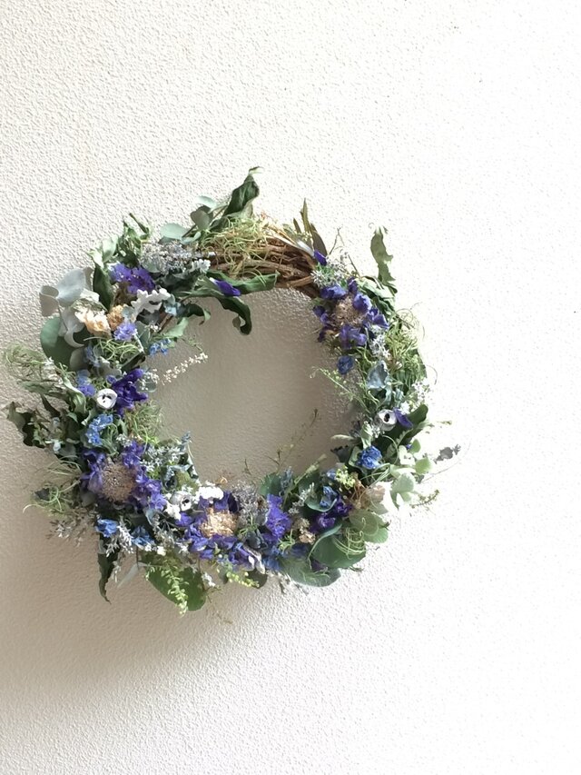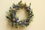 花材:スカビオサ、デルフィニューム、スターチス、ユーカリ、ゴアナクロウ、タタリカ、 ラムズイヤー、白枝ギク、ナズナなど