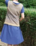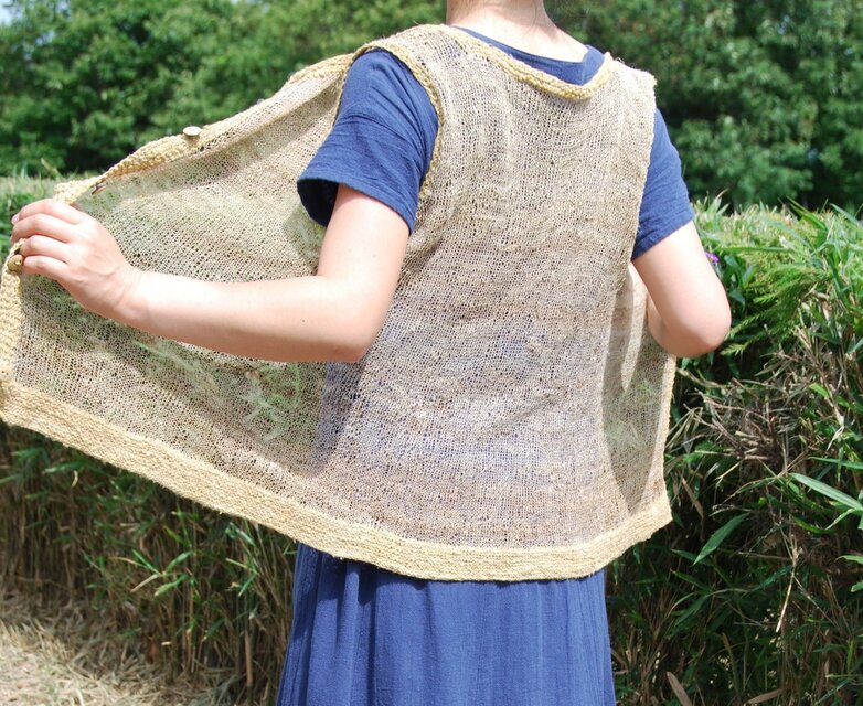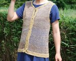 襟、裾、前立て、袖回りには、自宅で手紡ぎしたコットンをヨモギで染めた糸を合わせて編んでいます。
