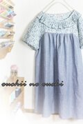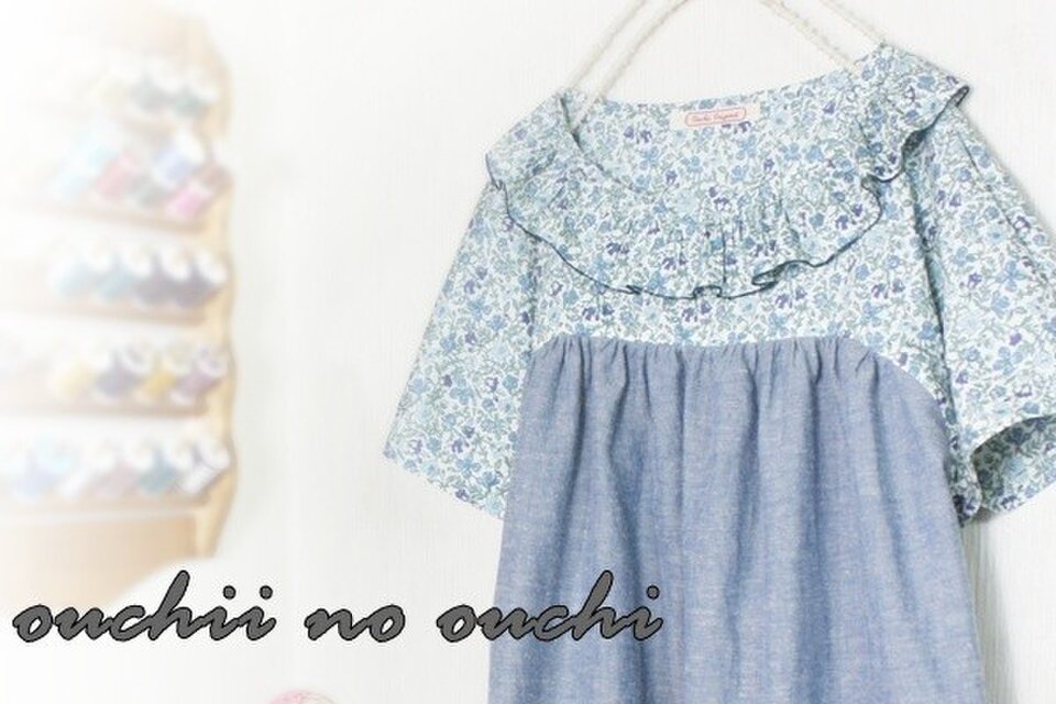 オーバーで胸の上の切り替えが優しい雰囲気のシルエットをつくって素敵です。またリバティで襟元の巻きロックフリル仕上げにしておりますので