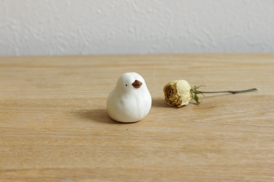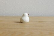 菓子屋さんからゆずりうけたひよこまんじゅうの型にひとつひとつ土を込めて、ちいさなひよこを作りました。こちら定番のシロマルシリーズ(マット)の種。くちばしの色は茶色です。ナチュラルな雰囲気。体全体はマットの釉薬をかけています。本物の大福のよう。