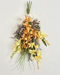 花材:アーティフィシャルフラワークロコスミア・ルシアファレノ・ベロニカ・ドラセナリーフ・シダー・ペアグラス・リボンなど