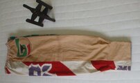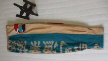 木綿の胴裏を柿渋で染めたものと大漁旗を半々に使ったパンツです。