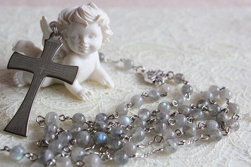 虹色の光「ラブラドレッセンス」もたくさん入った高品質のラブラドライトを使用したとても神秘的なロザリオです。