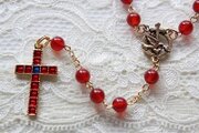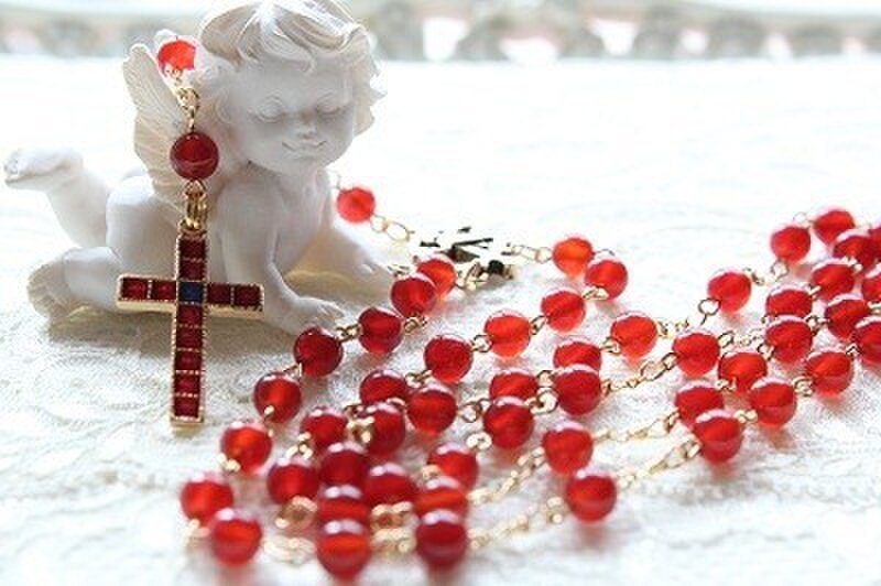古くから「幸運」「幸福」を呼ぶ石とされてきたカーネリアンのAAAグレードを使用しています。とても綺麗で透明感のある赤とゴールドパーツで存在感のあるロザリオが出来ました。
