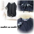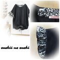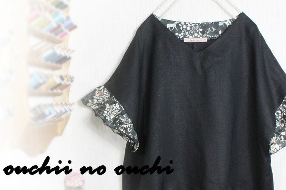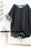リネン100ブラックとリバティタナローン定番人気柄ヨシエ ブラックで巻きロックフリル袖のドロストブラウスをおつくりしました。