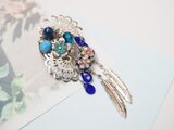 色合い・形様々なチェコビーズも鮮やかな透明のカプリブルー、柔らかな不透明のブルー、扇のモチーフに下げた涙型を平たくした形のコバルトブルー。。。と、様々に散らしました。