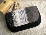 フラップ部分に3種類のアンティークレースと麻黒ダンガリーをパッチワークのように