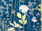 生地の色は地の色が、ネイビー(グリーンっぽい)、花の色にカスタードイエロー、ライトブルー、ライトパープルなど、葉の色にライトグリーンなどが使われています。