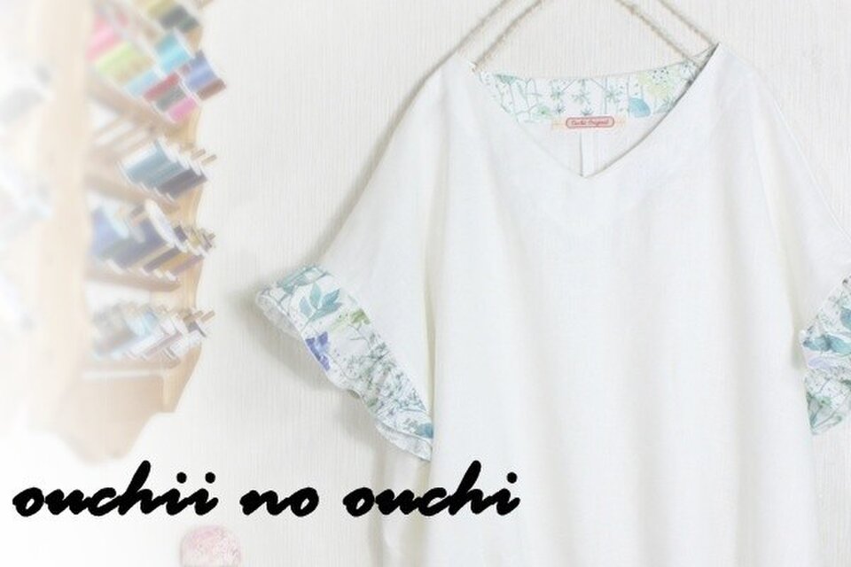 リネン100ホワイトとリバティタナローン大人気柄<Irma>(イルマ)で巻きロックフリル袖のドロストブラウスをおつくりしました。