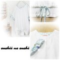甘くならないように見返し仕立てVネックで 前身頃裾はボタンホールを開けリバティイルマでリボン紐をお作りしました。後ろ身頃裾はラウンドに後ろ下がりとなります。