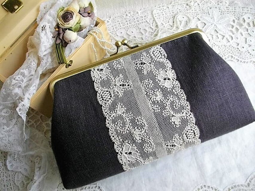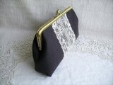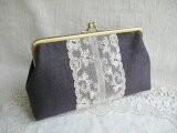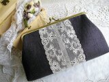 ダークブラウンに近いシックなパープルリネンとアンティークレースを組み合わせたがま口ポーチ