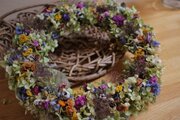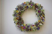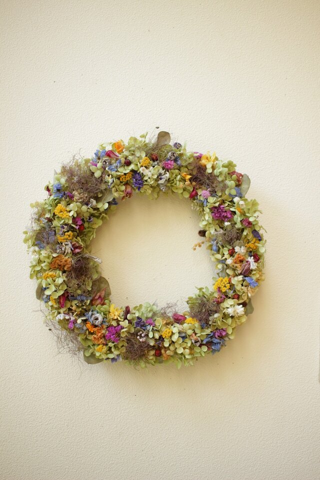花材:アナベルドライ、スターチス、ケイトウ、デルフィニューム、ユーカリ、