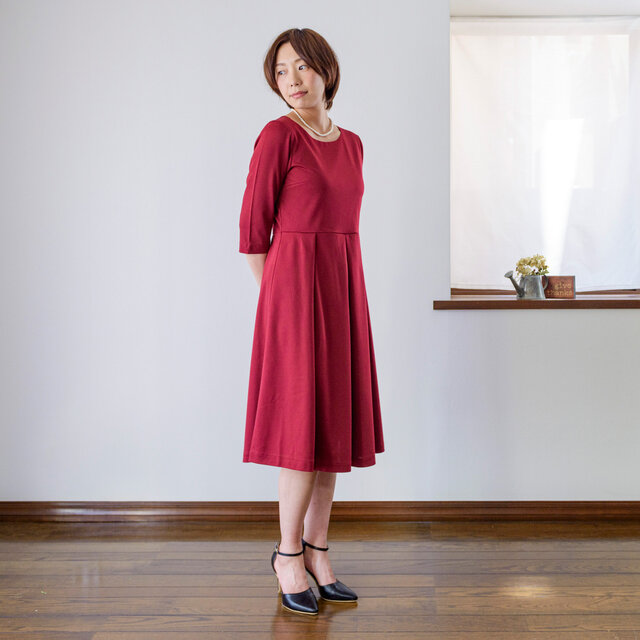 ┗ポケットやファスナー、ボタンなど余計な装飾を一切はぶき、シンプルを極めたワンピースです。その分小物やアクセサリー、着る人を引き立てます。