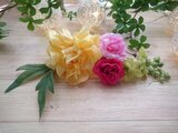 結婚式の前撮り用にお願いしました。 無事に前撮りが完了したので、感想書かせて頂きます。 自分では花の色合いや種類を決めることができず、色打掛の写真を元に作って頂きました。 完成品は依頼した通り、上品で存在感のある綺麗な花飾りでした。 実際に色打掛を着てヘアメイクさんに付けてもらったら、着物とピッタリ! 大大大満足です! お願いして本当に良かったです。 ありがとうございました。