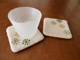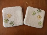 織り目の細かいリネン生地に、オリジナル図案の「たね」を刺したコースターです。