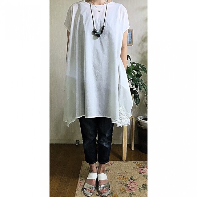 デザインはシンプルですが、全体をたっぷりとさせて脇は大きくスリットを入れているため、風を孕む涼しいチュニックになりました。