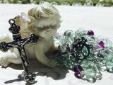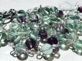 透明度の高いきれいなフローライトを使用しました。ライトグリーン、ライトブルーの中にパープルが映える混合色ですが優しい印象のロザリオです。