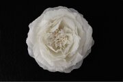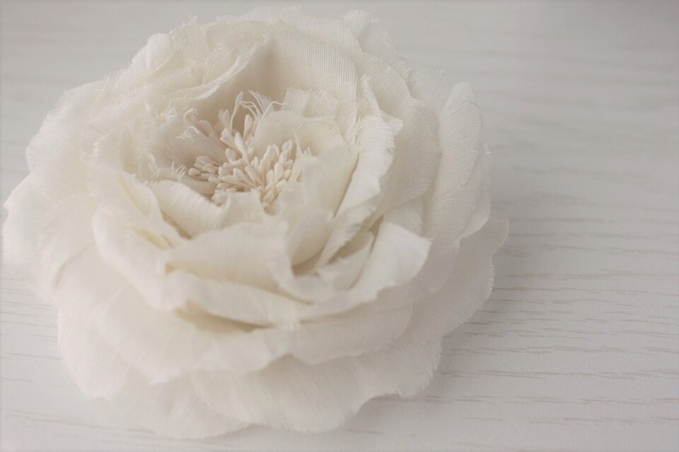 花びらの重なりが繊細なオールドローズのコサージュです。さらりとしたナチュラルホワイトリネンに、さりげなく光るナイロンが織り込まれた生地を使用しています。バラの咲き誇る様子をボリュームたっぷりに表現しました。