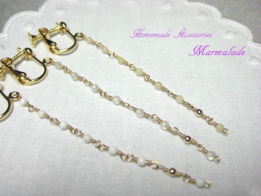 ☆極小の丸玉を丁寧につなぎました。ビーズを左右で違う位置に入れて、さりげなくアシンメトリーなデザインになっています^^。