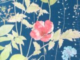 生地の色は地の色が、ネイビー(グリーンっぽい)、花の色にカスタードイエロー、ライトブルー、ライトパープルなど、葉の色にライトグリーンなどが使われています。