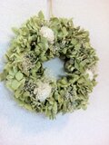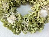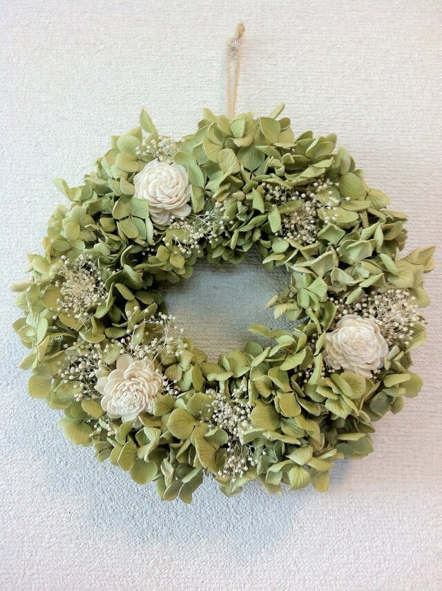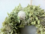 グリーンの綺麗な色のあじさいと、ソーラーローズ、かすみ草のシンプルで爽やかなリースです。