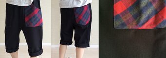 色は黒で、赤系のチェック生地をポケットに使用しました。