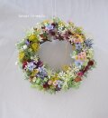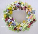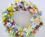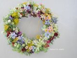 リース土台:ナチュラル素材 直径約20センチ リース素材:アーティフィシャルフラワ-(造花):ベルフラワー・ハイドランジア・レースフラワー・ベロニカ・ヒペリカムの実・ワレモコウ・ピンクの小花・白い小花・青い小花・黄色菊・紫の花・ユーカリ、など。その他:黄色麻紐リボン(枝に掛けてあります。取り外しできます。)、など。