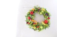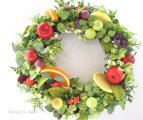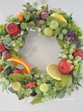リース土台:ナチュラル素材 直径約20センチ リース素材:アーティフィシャルフラワ-(造花):アップル・レモンスライス・オレンジスライス・マスカット・パープルグレープ・チェリー・赤いラズベリー2種類・グリーンラズベリー・フリルベリー・オリーブの実・ミント・ユーカリ、など。その他:リボンモチーフ、など。