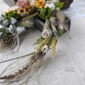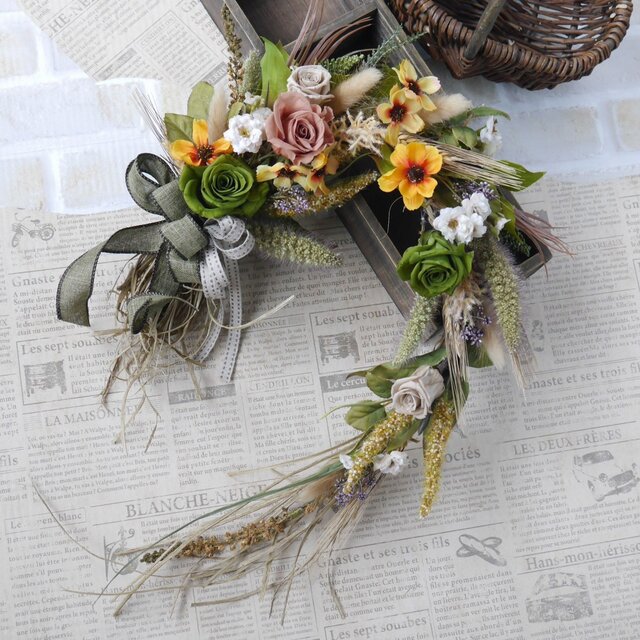 わらをベースにドライフラワーの小麦、センタリアブラック、ラグラス等秋の実りを感じさせる穂と秋色のプリザーブドフラワー、アーティフィシャルフラワーをミックスして馬蹄形のリースを作りました。