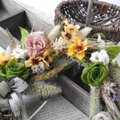 ちょっと渋めのグリーンのプリザーブドフラワーのバラにオレンジ色のコスモス、アンティークホワイトの小バラが可愛らしさを添えます。