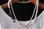 三角プレートと小さなスティックがポイントの淡水パールネックレスです。