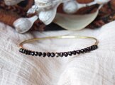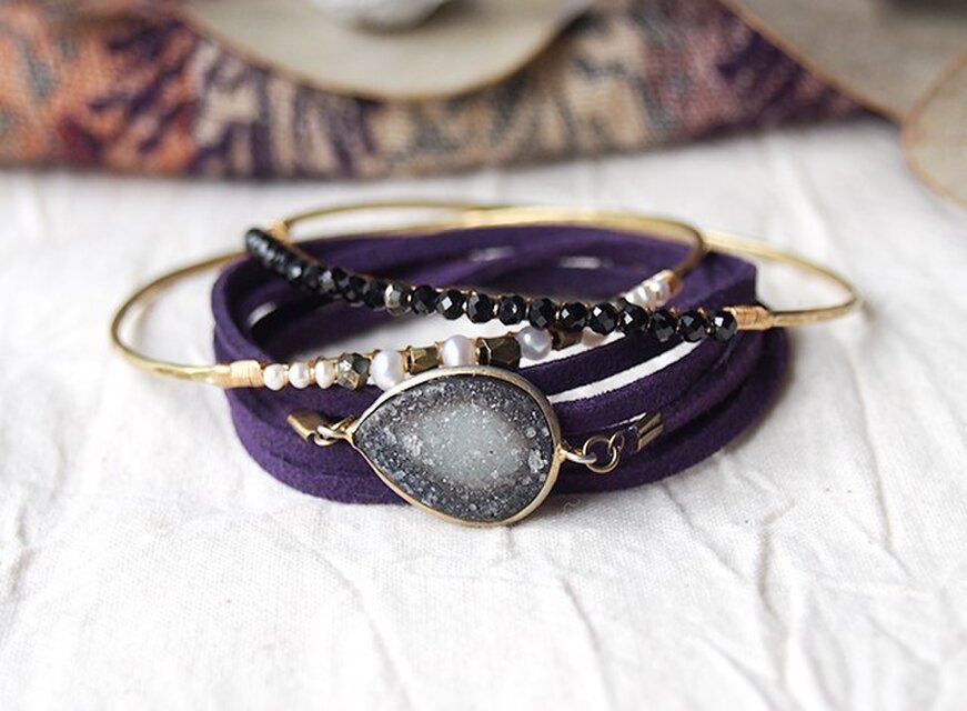 細かい結晶がきらきらと光るドゥルージークォーツ、艶っぽいブラック、オリエンタルなパールと真鍮のバングル。